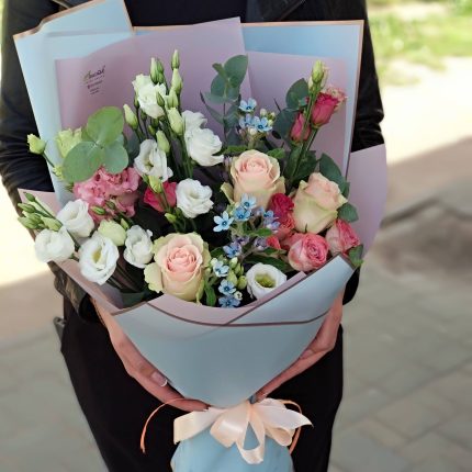 Бархатный цилиндр из голубых диантусов, розовых пионов и ароматной маттиолы