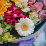 Гербера белая – 4 шт.Гербера красная – 2 шт.Гербера желтая – 2 шт.Эвкалипт – 4 шт.Матрикария – 4 шт.Альстромерия красная – 2 шт.Альстромерия желтая – 2 шт.Альстромерия белая – 2 шт.Альстромерия розовая – 2 шт.Альстромерия фиолетовая – 2 шт.