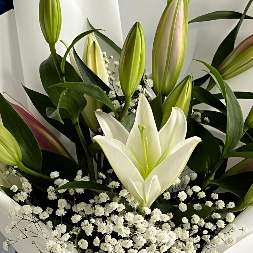 лилия ориентальная розовая – 2 шт.лилия розовая евро – 1 шт.Гипсофила – 1 шт.Дизайнерская упаковка – 1 шт.