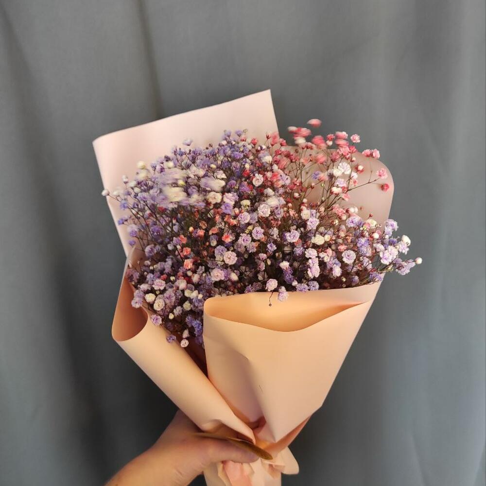 Гипсофила розовая – 2 шт.Гипсофила фиолетовая – 1 шт.Пленка – 1 шт.Лента – 1 шт.