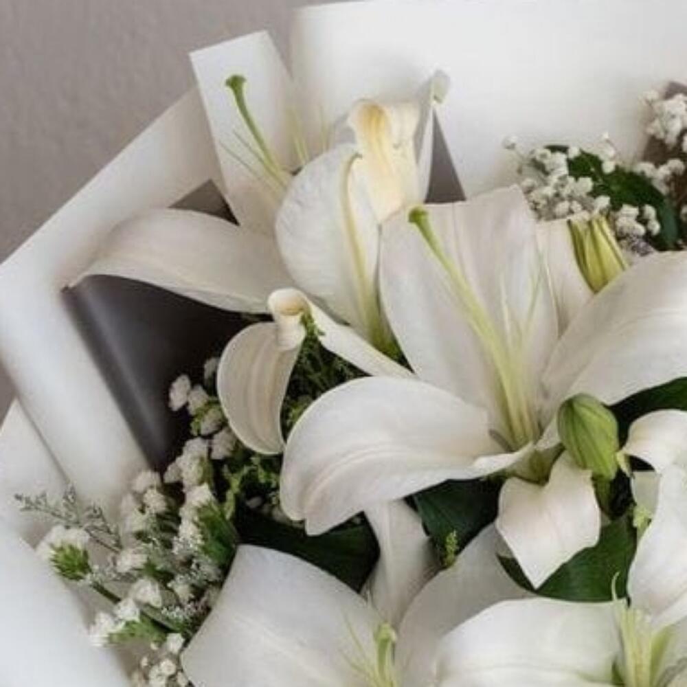 Лилия белая – 3 шт.Гипсофила – 3 шт.Фисташка пучок – 1 шт.Упаковка дизайнерская – 4 шт.