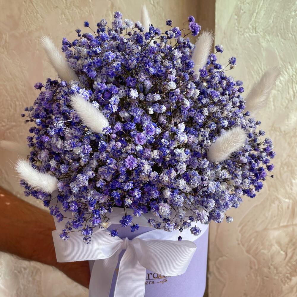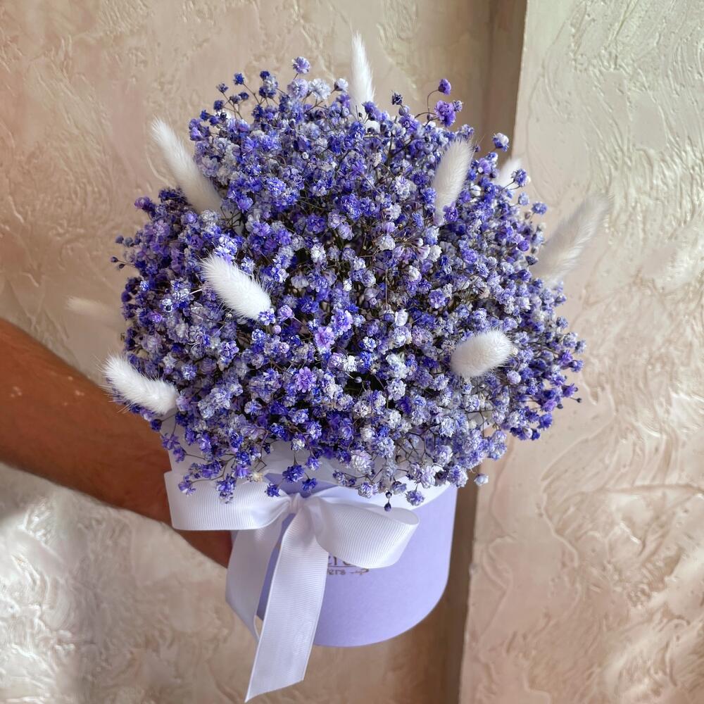 Гипсофила – 7 шт. Лагурус – 11 шт. Оазис флористический – 1 шт. Лента репсовая – 1 шт. коробка шляпная d15 – 1 шт.