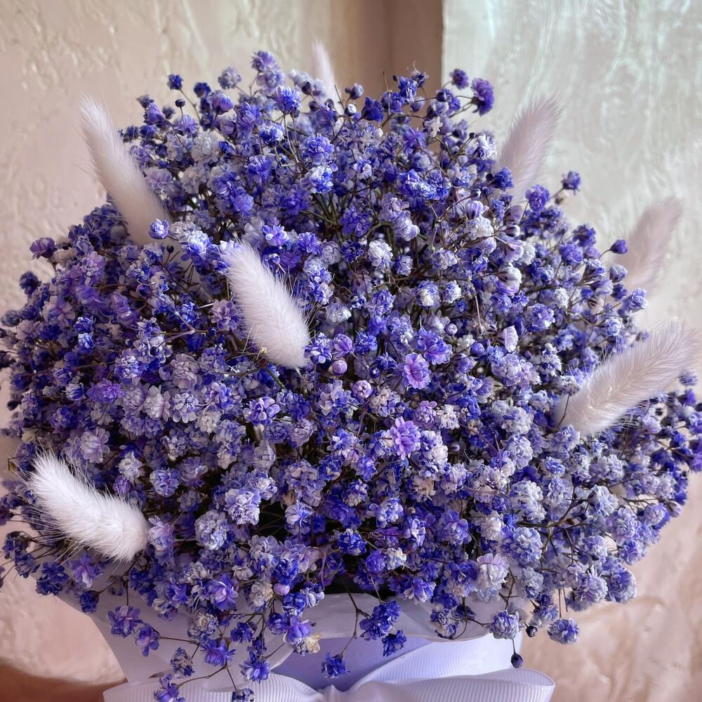 Композиция – визитная карточка Amsterdam Flowers. "Фиолетовый сон" понравится каждой девушке, нежнейшая сиреневая гипсофила и пушистые хвостики белого лагуруса не оставят равнодушной. Тем более такой букетик будет очень долго радовать поучительницу.