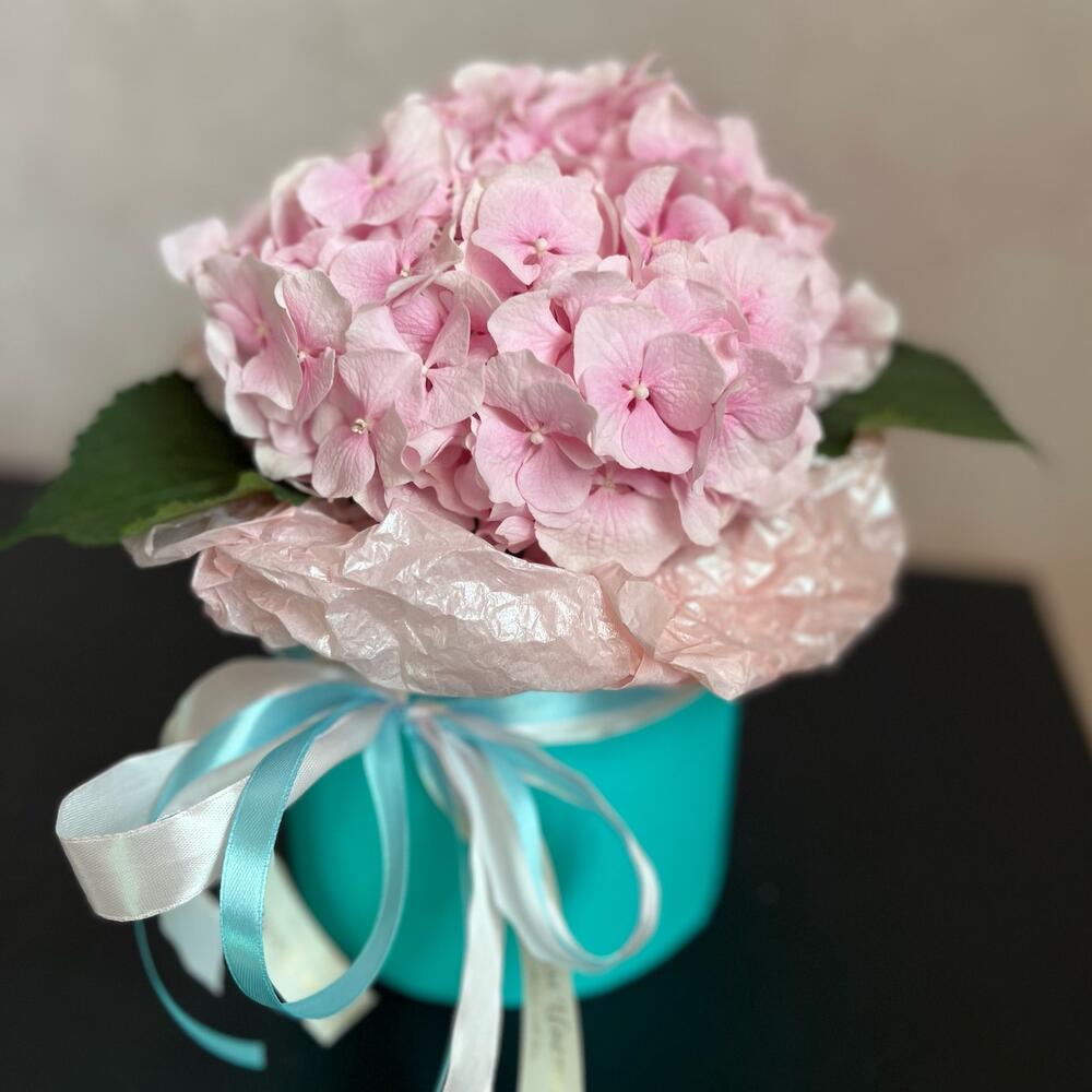 шляпная коробочка s – 1 шт.Тишью – 1 шт.Атласная лента – 1 шт.Гортензия – 1 шт.
