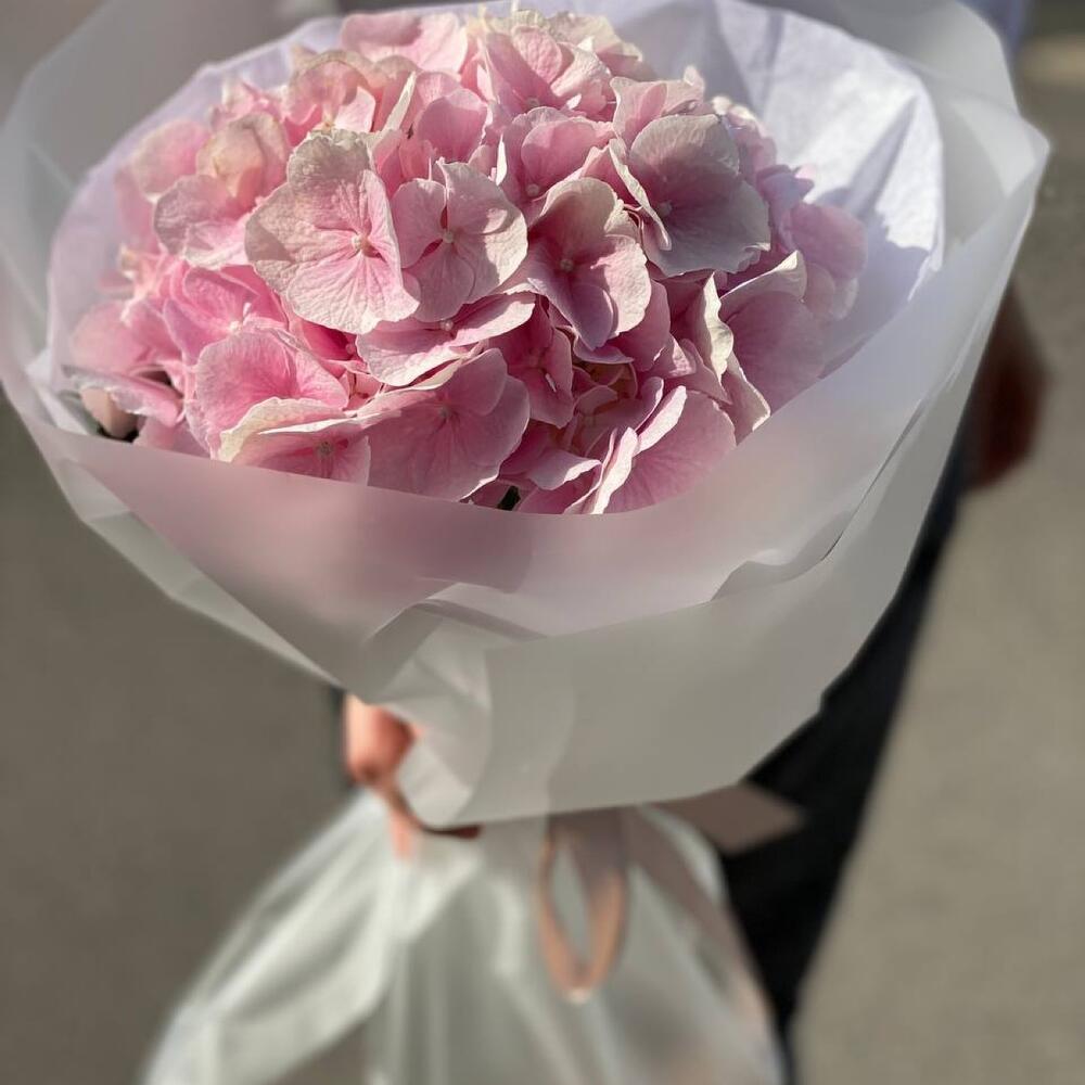 Аккуратный соло-букет с гортензией в элегантной полупрозрачной упаковке. Компактный размер и моно-исполнение подойдут по любому поводу