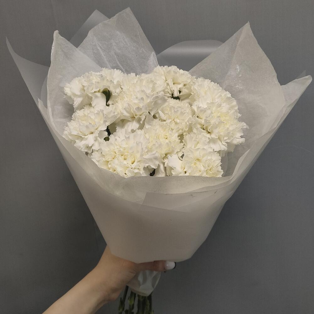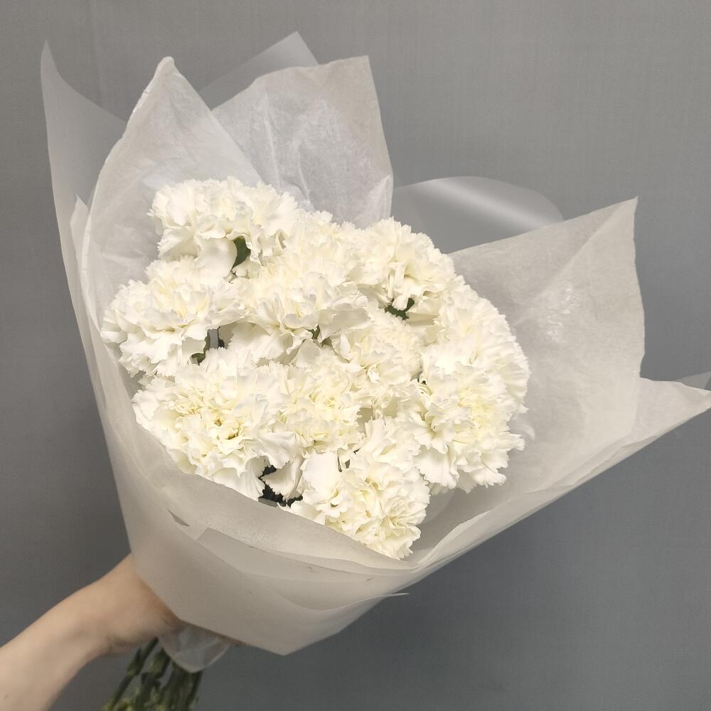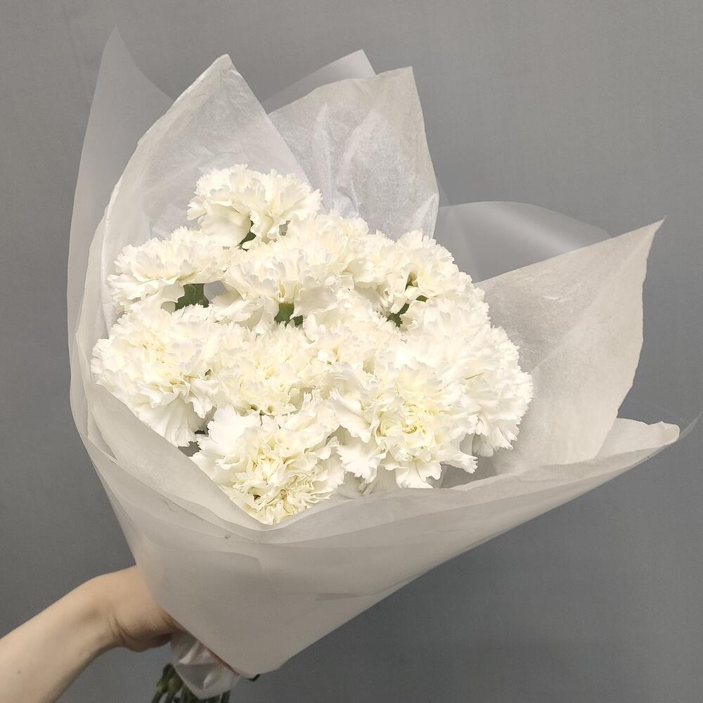 Гвоздика белая – 11 шт.Тишью – 1 шт.Пленка матовая – 1 шт.