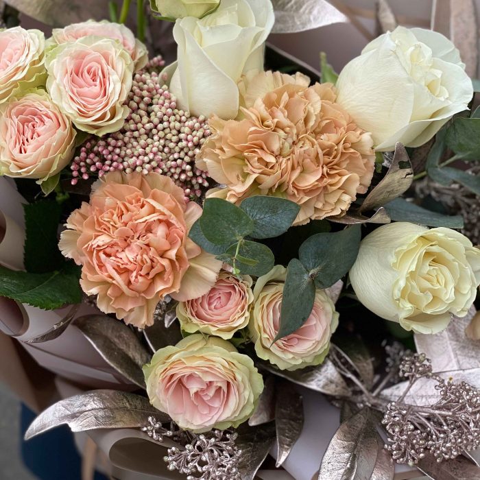 Гвоздики, Лизиантусы, Розы, Тюльпаны