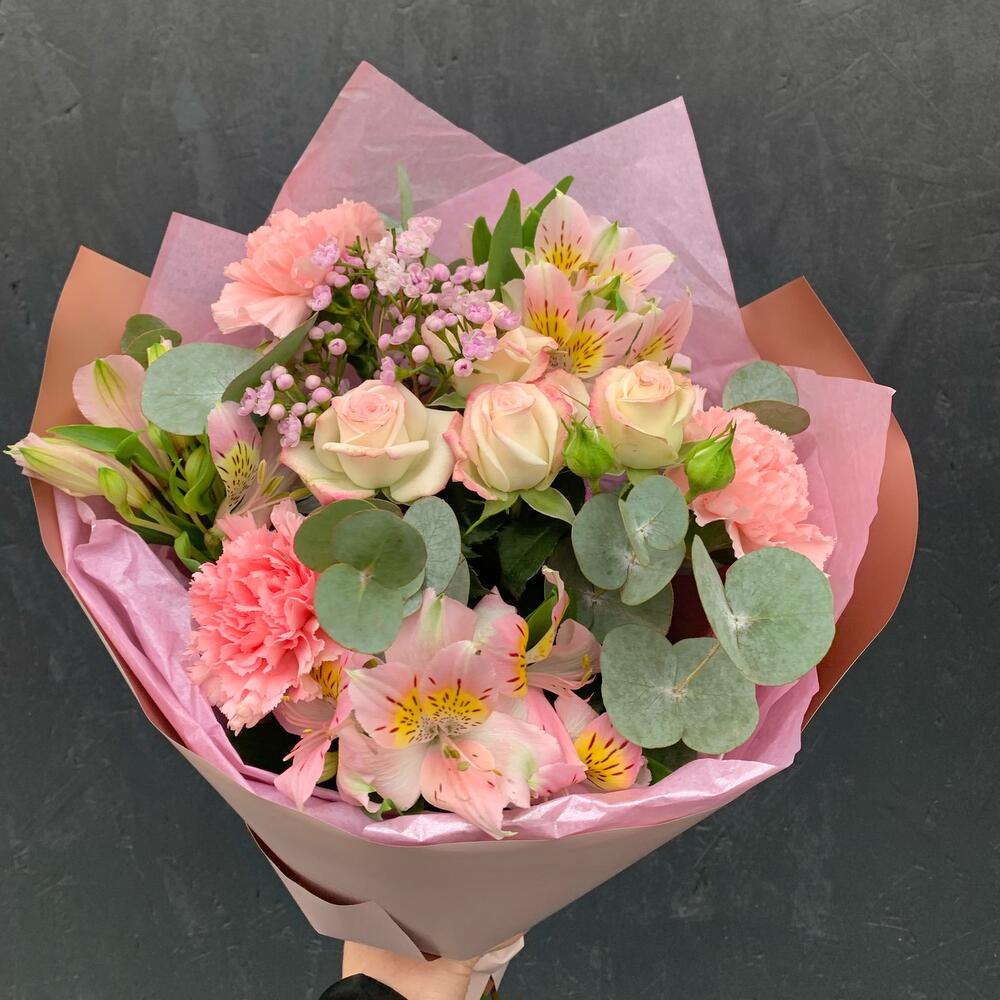 Букет с альстромериями, кустовой розой, гвоздикой и ваксфлауэром