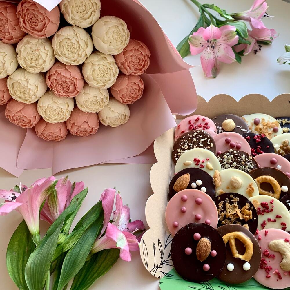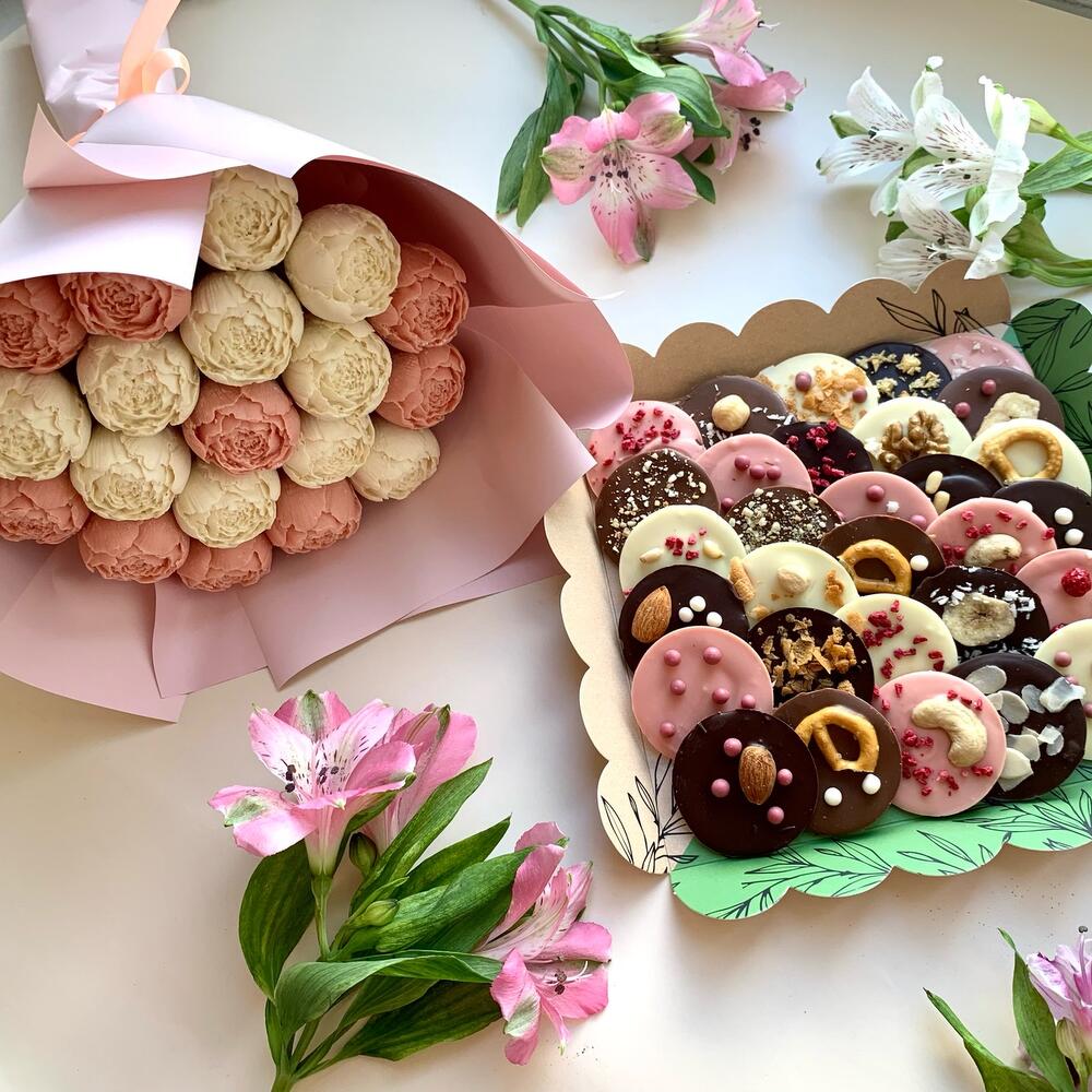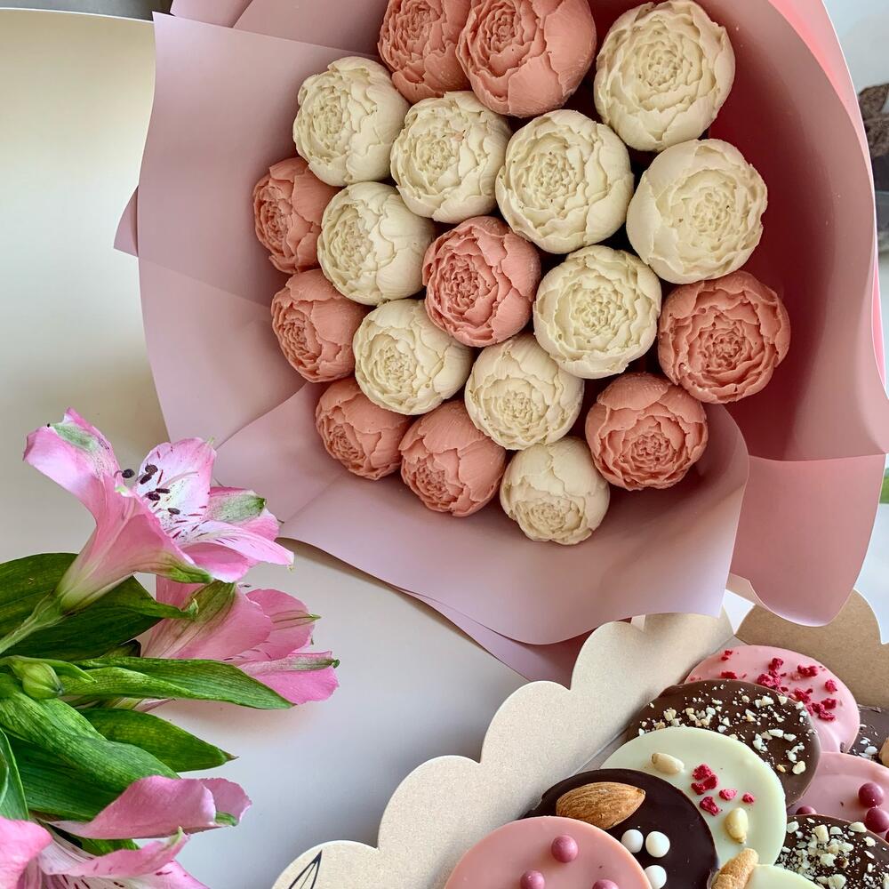 Букет шоколадных пионов и коробка медиантов