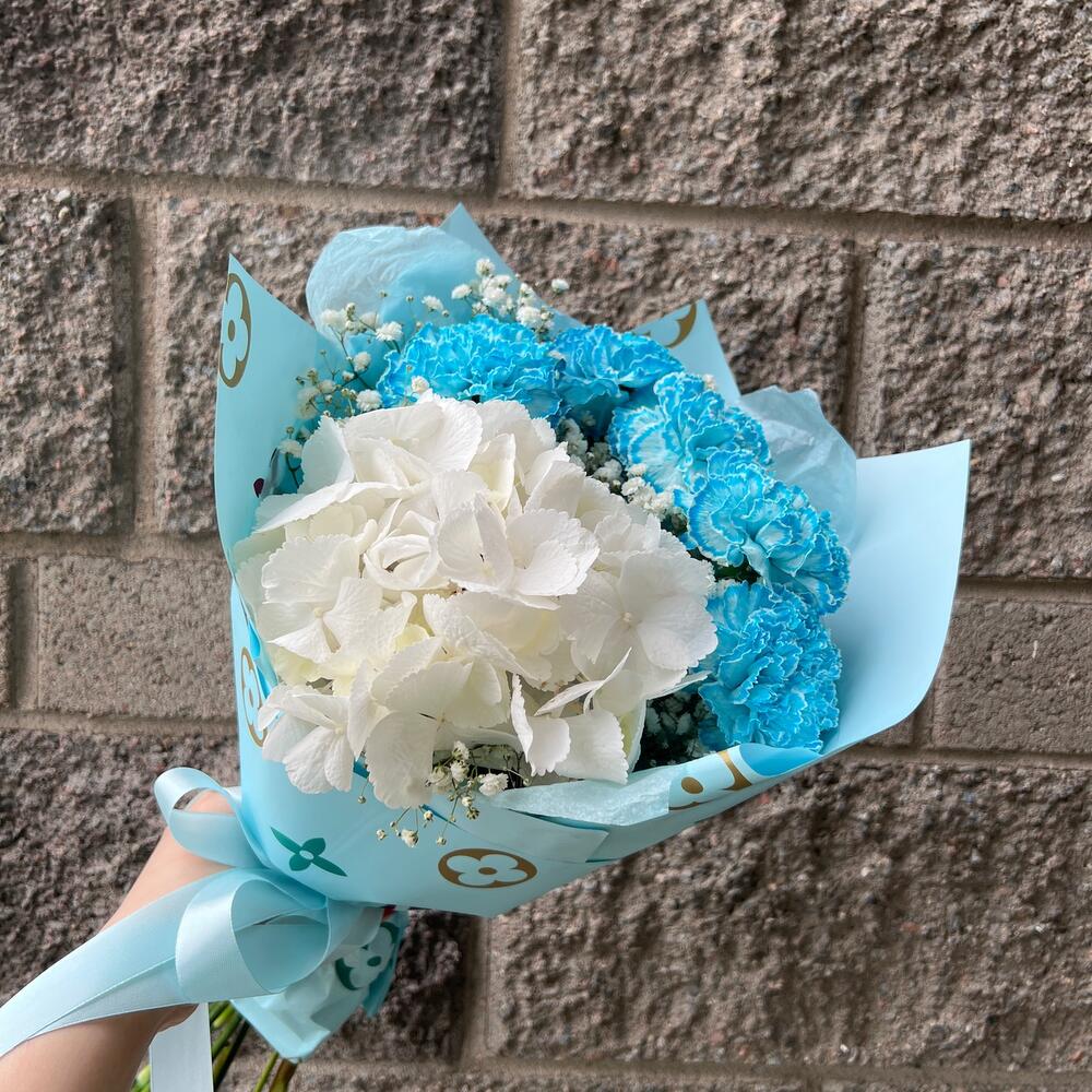 Гортензия – 1 шт.Диантус – 5 шт.Гипсофила – 2 шт.Упаковка дизайнерская – 4 шт.Лента атласная – 2 шт.
