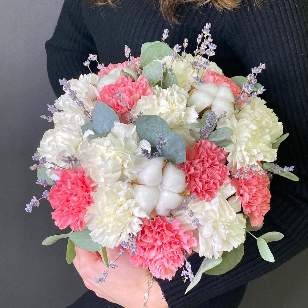 Диантус – 17 шт.Эвкалипт – 3 шт.лаванда (сухоцвет) банч – 1 шт.Хлопок – 3 шт.Шляпная коробка – 1 шт.Оазис флористический – 1 шт.
