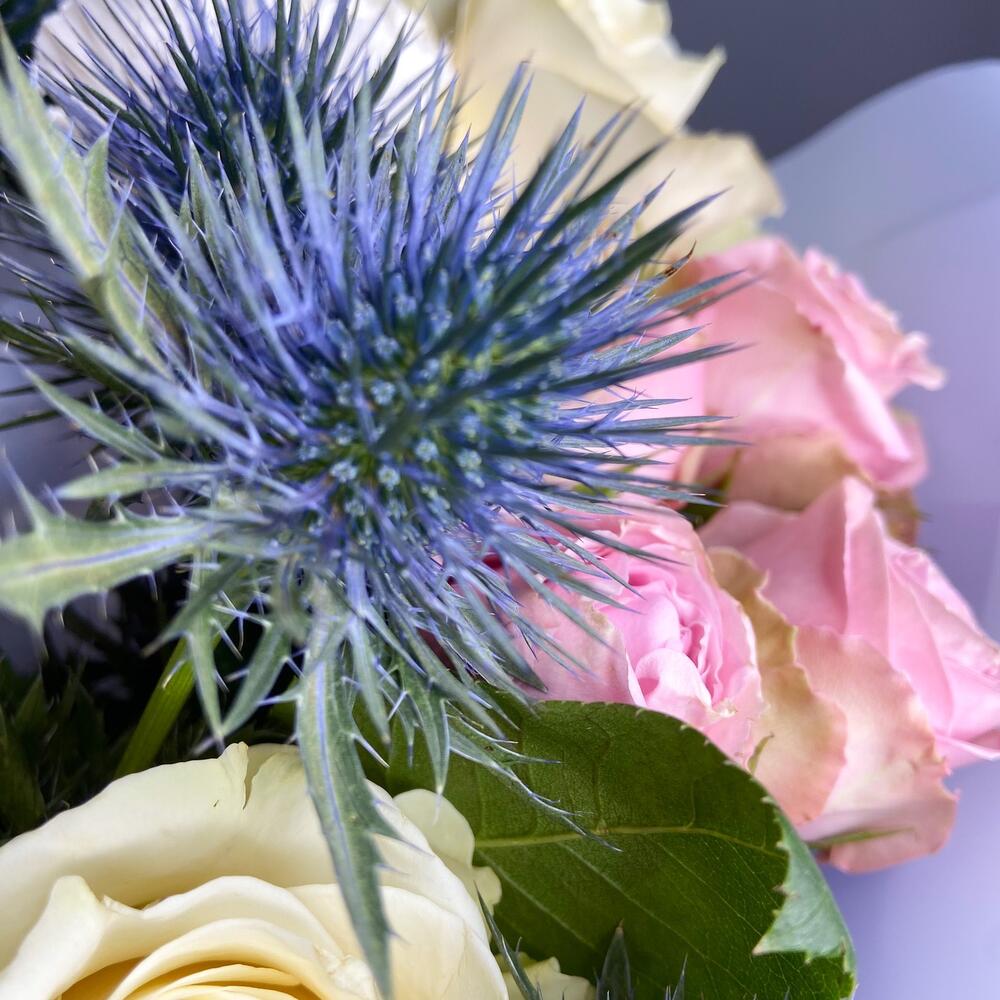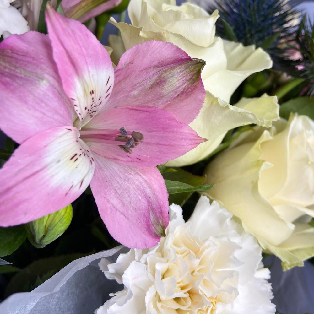 Альстромерия – 1 шт.Роза кустовая – 2 шт.Упаковка – 1 шт.Гвоздика – 4 шт.Эрингиум синий – 2 шт.Роза белая мондиаль – 3 шт.