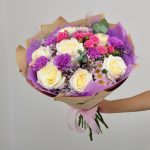Букет с сиреневыми диантусами, хризантемами и белыми розами.Нежное сочетание цвета окутает любовью и заботой вашего получается)Букет можно подарить на рождение ребёнка, крестины, свадьбу, 1 сентября или другое праздничное событие)