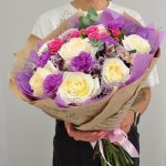 Альстромерия – 2 шт.Роза кустовая – 1 шт.Эвкалипт – 1 шт.Лента атласная – 1 шт.Диантус – 5 шт.Сантини – 2 шт.Крафт – 1 шт.Роза белая пионовидная – 7 шт.Кермек – 1 шт.Пленка матовая – 1 шт.