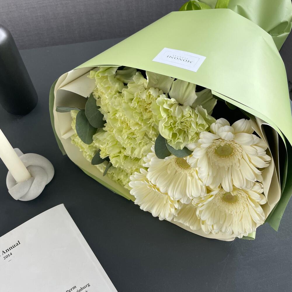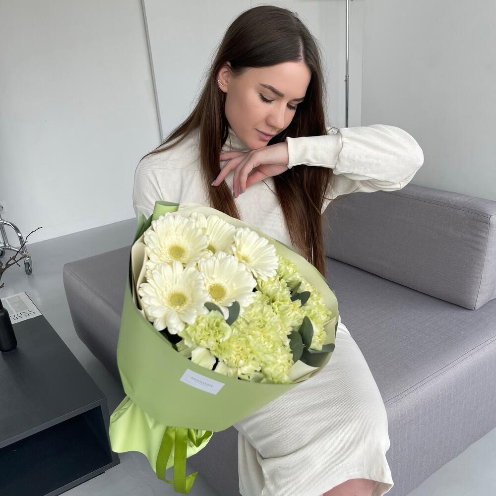 Гербера – 5 шт.Диантус – 14 шт.Эвкалипт – 3 шт.Упаковка дизайнерская – 2 шт.Лента атласная – 1 шт.наклейка фирменная – 1 шт.