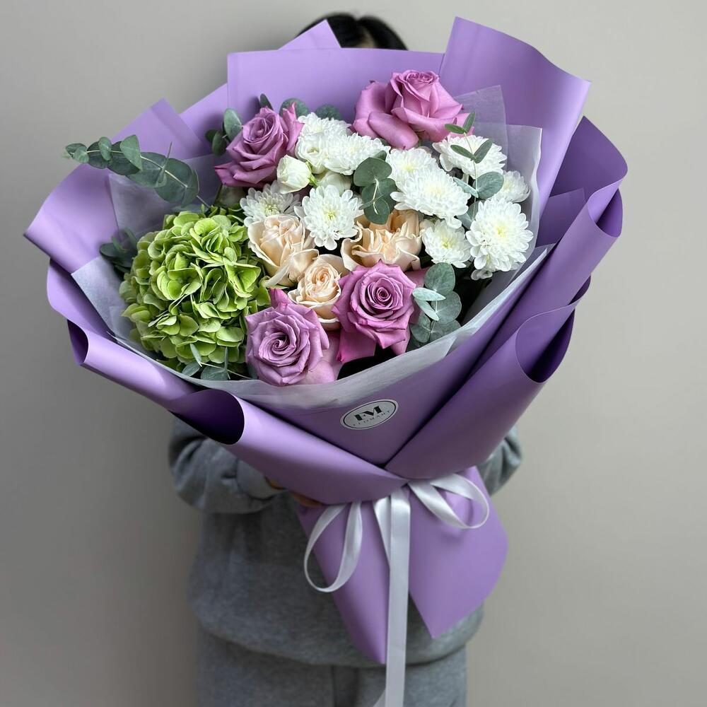 Евро-Букет из Гортензии ,Пионовидных Роз,Лизиантсуов и Белых роз + открытка ручной работы в подарок