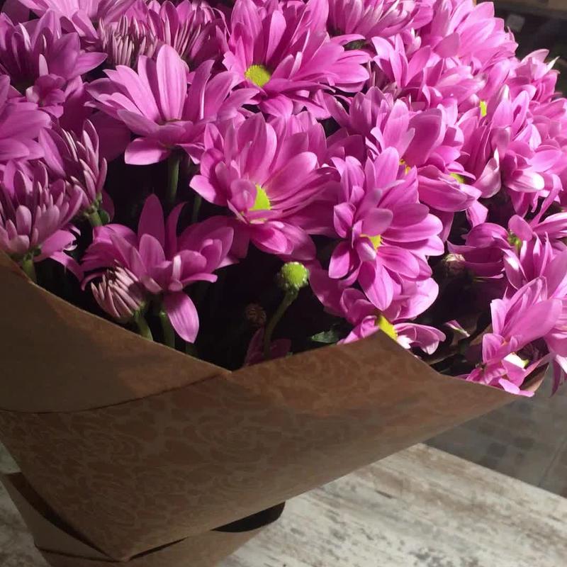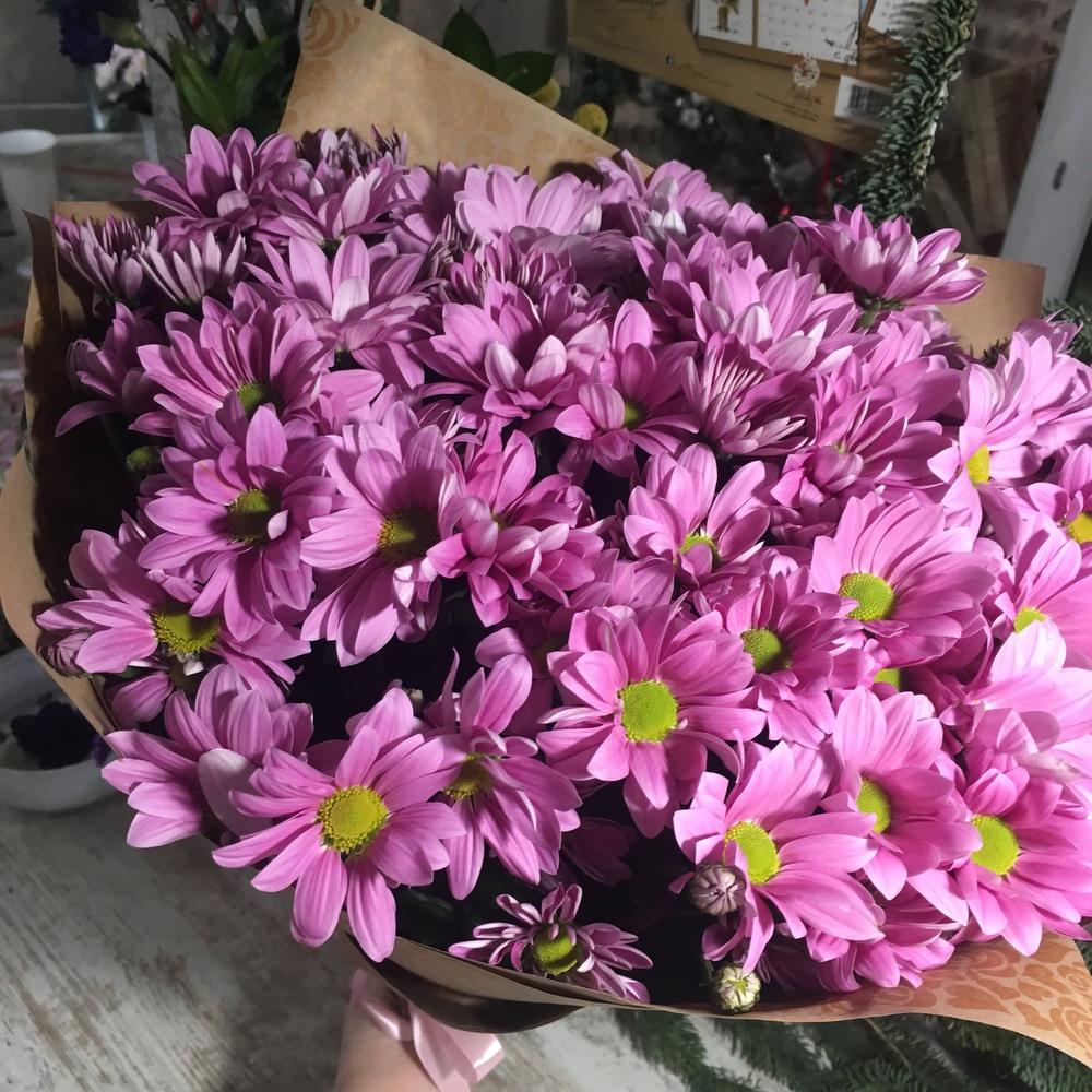Кустовая хризантема – 11 шт.Лента атласная – 1 шт.Крафт упаковка – 1 шт.