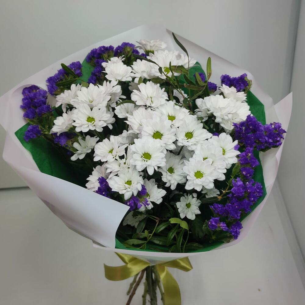 Хризантема кустовая Сантини – 7 шт.Статица – 2 шт.зелень фисташки – 1 шт.Дизайнерская упаковка – 1 шт.