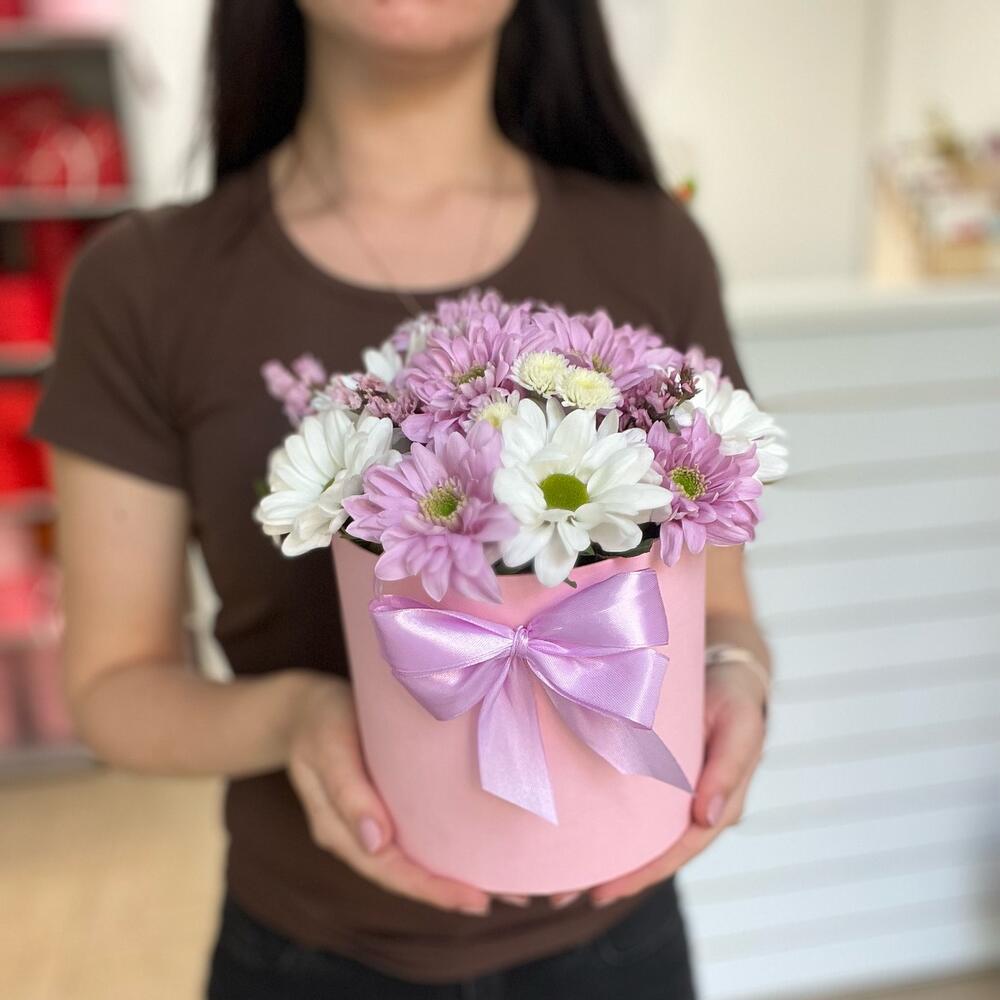 Хризантема кустовая сиреневая – 2 шт.Хризантема кустовая белая – 1 шт.Хризантема Сантини – 1 шт.Статица – 1 шт.Зелень – 1 шт.Шляпная коробка – 1 шт.Флористическая губка – 1 шт.Атласная лента – 1 шт.Открыточка с вашими пожеланиями – 1 шт.