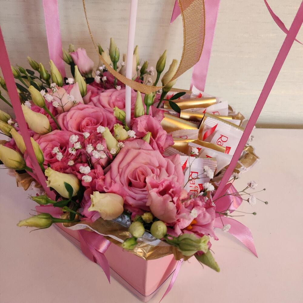 Коробка сердце – 1 шт.розы эквадор (60 см) – 7 шт.Лизиантус – 5 шт.Конфеты Raffaello – 250 гр.шар бабл с перьями – 1 шт.