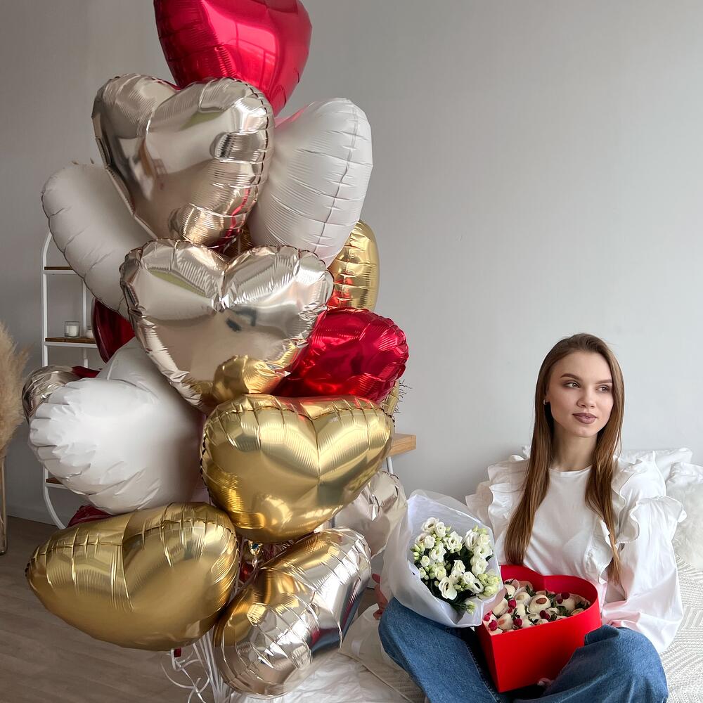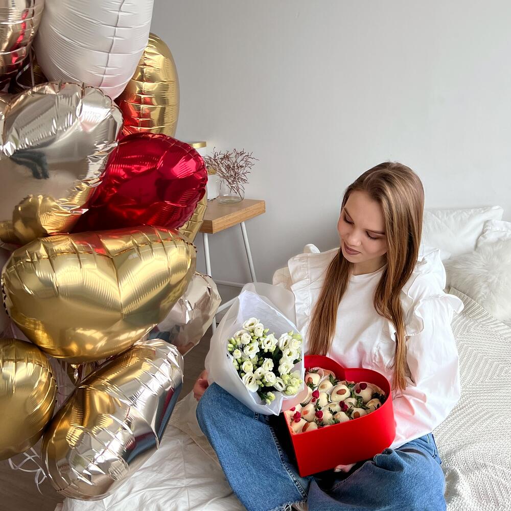 Состав:— Большая связка фольгированных шаров сердец – 20шт.— Букет из 5 веточек белой эустомы— Клубничный набор “Сердце”, большоеВ состав набора входит:- 7 ягод в белом бельгийском шоколаде Callebaut, декор: миндаль цельный- 8 ягод в белом бельгийском шоколаде Callebaut, декор: цельная сублимированная малина- 7 ягод в белом бельгийском шоколаде Callebaut, декор: золотой кандуринПримечание:— Клубничный набор имеет прозрачную крышку и перевязан атласной лентой с бантом.— Размеры упаковки 21*22 см.— Натуральный продукт. Срок годности клубники в шоколаде до 24 часов. Храните ягоду в холодильнике при температуре +4..+8 градусов.