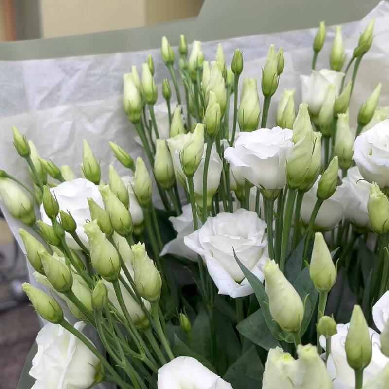 Лента атласная – 2 шт.Лизиантус белый – 9 шт.Упаковка корейская пленка – 1 шт.тишью кремовое – 1 шт.