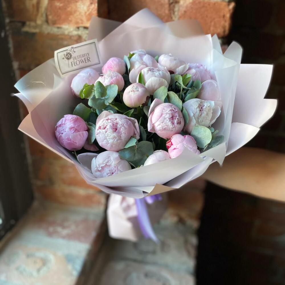 Букет из 17 розовых пионов и эвкалипта в дизайнерской упаковке “Анита Вулф”