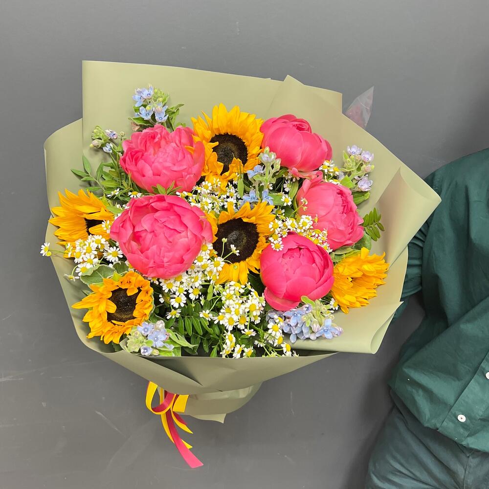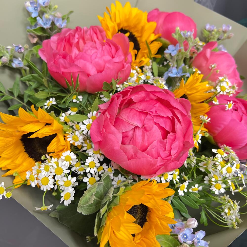 ЕЛЕНА роскошный букет из пионов, подсолнухов и ромашек