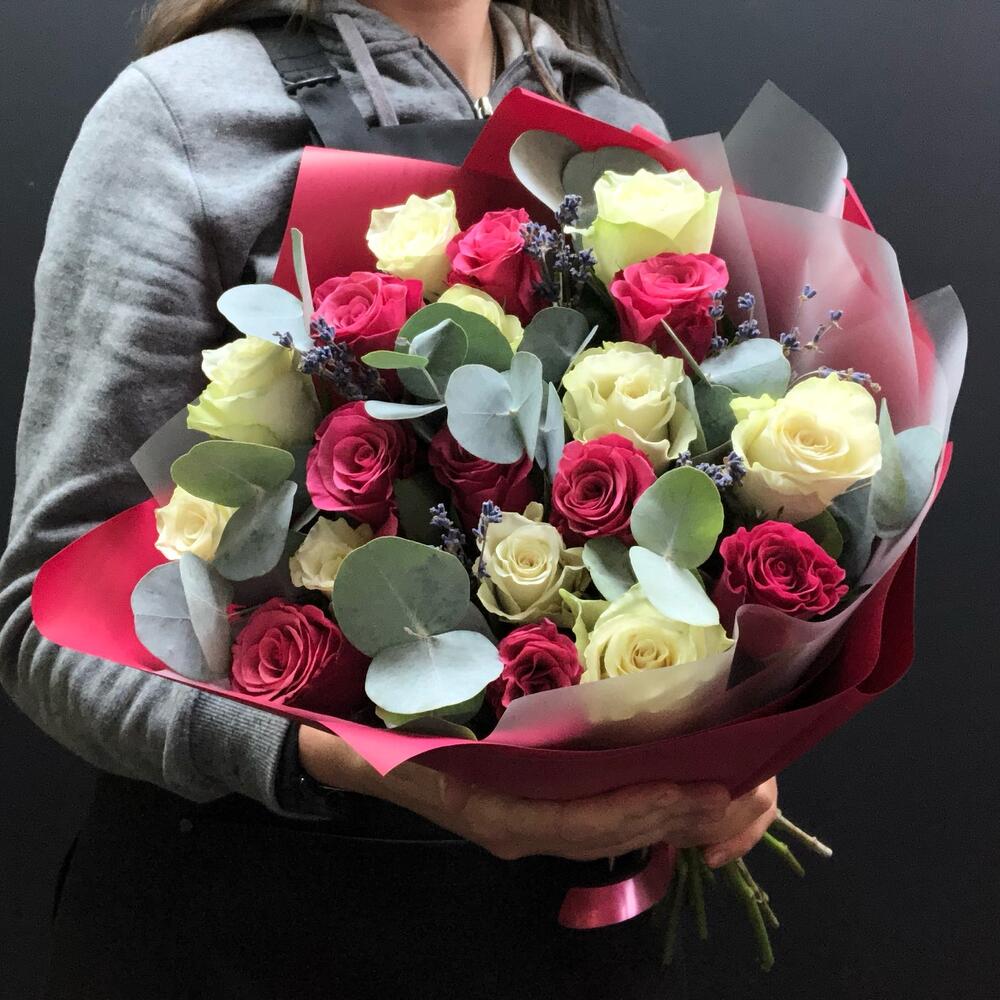 Лаванда (сухоцвет) – 5 шт.Эвкалипт – 3 шт.Роза Кенийская – 19 шт.Упаковка дизайнерская – 2 шт.