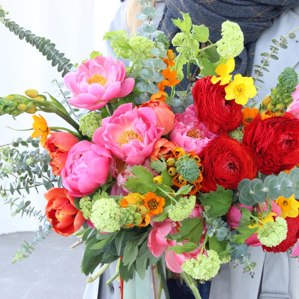 Пион коралл шарм – 5 шт.Орнитогалум – 3 шт.Нарцисс – 5 шт.Тюльпан – 6 шт.Вибурнум – 4 шт.Роза пионовидная – 3 шт.