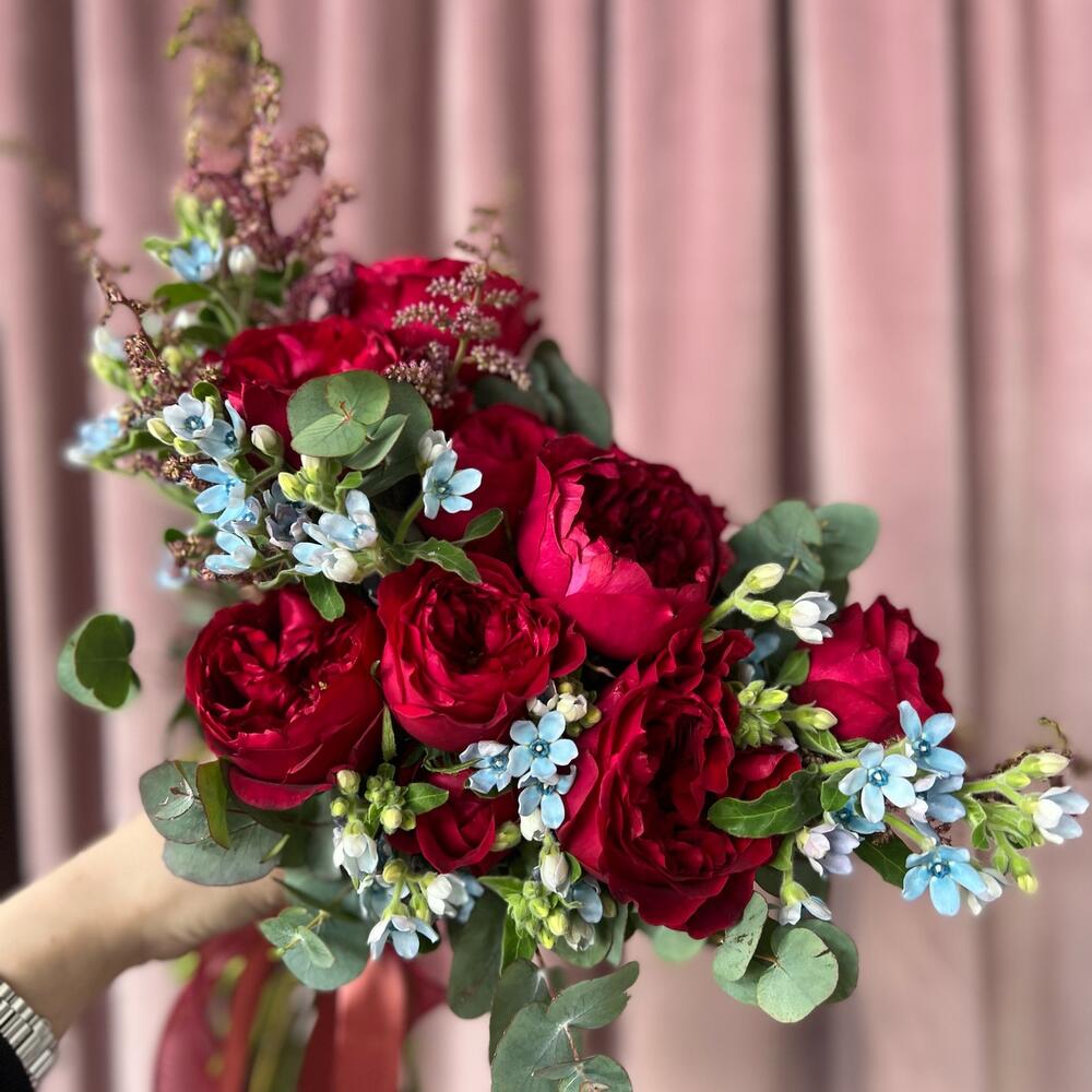 Авторский букет из пионовидных роз, оксипеталум и астильба «Очарование»