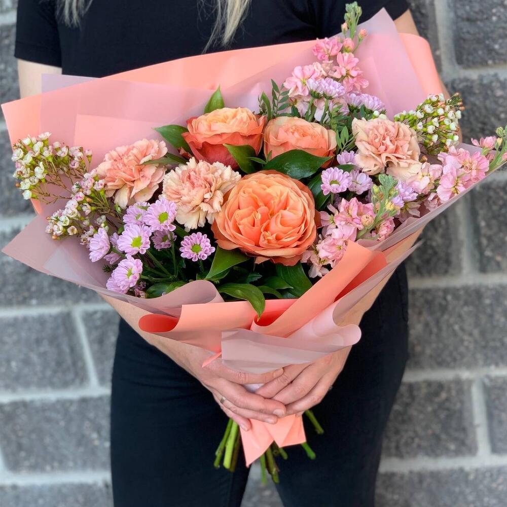 Роза пионовидная – 3 шт.Диантус – 3 шт.Сантини – 3 шт.Ваксфлауэр – 2 шт.Маттиола – 3 шт.Фисташка – 2 шт.Зелень – 10 шт.Упаковка дизайнерская – 1 шт.Лента атласная – 1 шт.