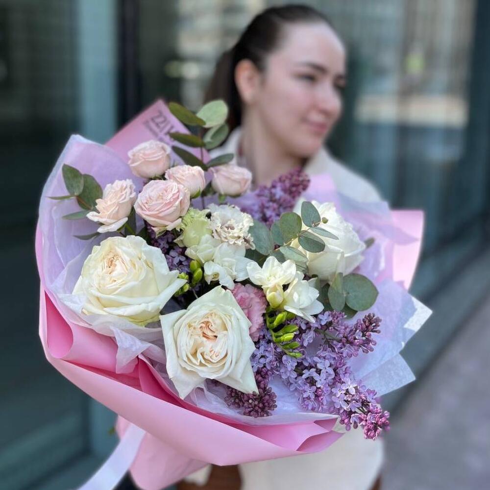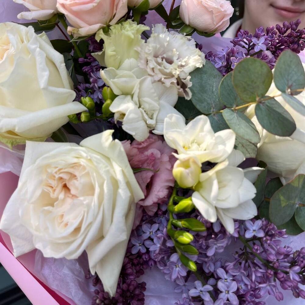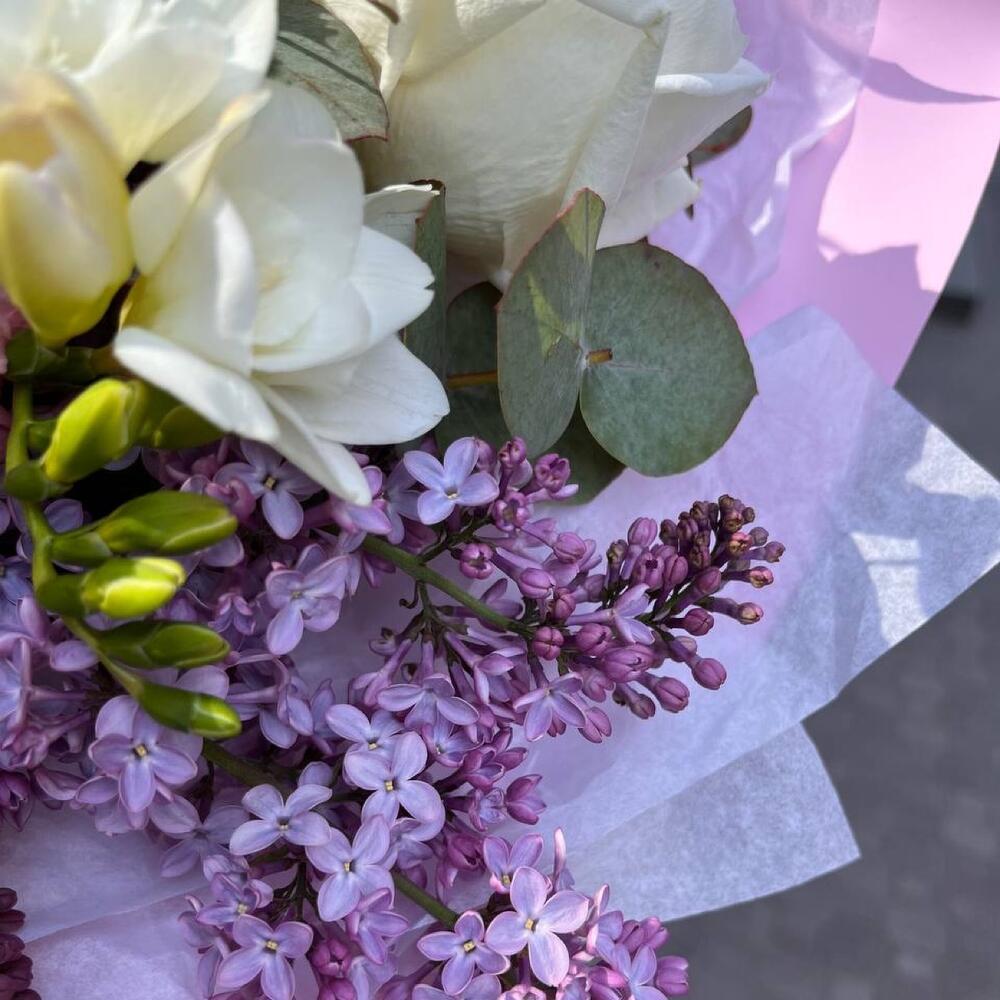 white o’hara – 3 шт.Фрезия – 2 шт.Роза кустовая пионовидная бомбастик – 1 шт.Эвкалипт Микс – 3 шт.Эустома – 1 шт.Сирень – 3 шт.Упаковка дизайнерская – 3 шт.Лента атласная – 1 шт.
