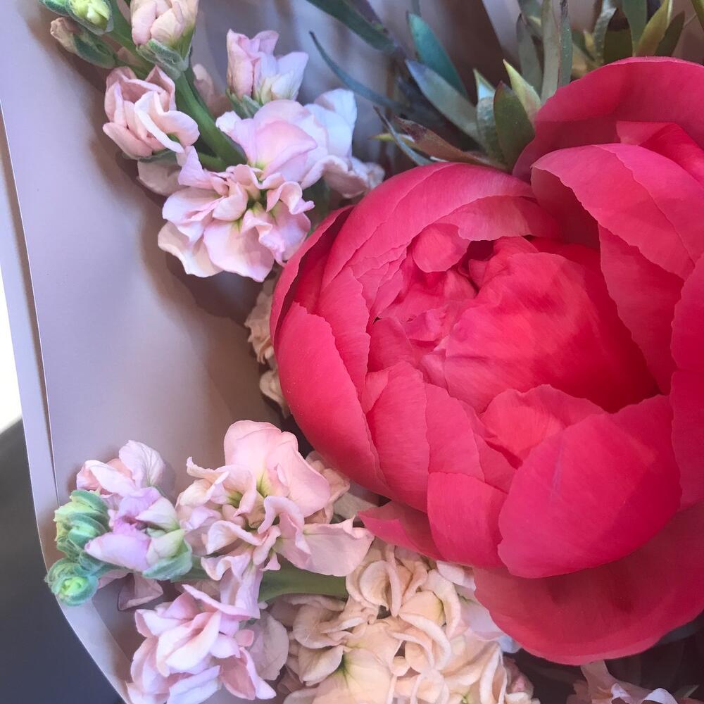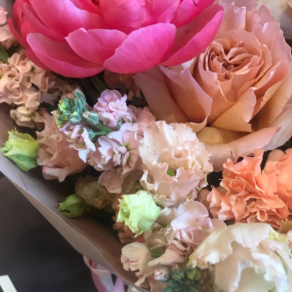 Пион коралл шарм – 3 шт.роза эквадор крупный бутон – 3 шт.Фритиллярия – 1 шт.Лизиантус – 1 шт.маттиола кремовая – 5 шт.Диантус – 5 шт.Сафари кустовой – 2 шт.Фисташка – 1 шт.Пленка матовая – 3 шт.Лента атласная – 3 шт.