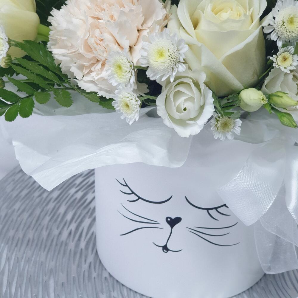 роза белая крупная – 2 шт.Маттиола белая – 1 шт.эустома белая – 1 шт.гвоздика белая сортовая – 3 шт.тюльпаны белые – 3 шт.папоротник ветка – 2 шт.сантини хризантема кустовая – 1 шт.Коробка шляпная с принтом – 1 шт.Лента атласная – 2 шт.Оазис флористический – 1 шт.Открыточка с вашими пожеланиями – 1 шт.