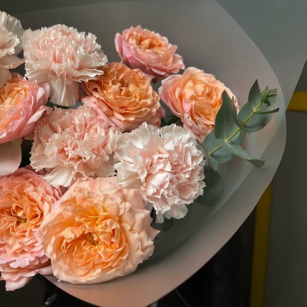 Эвкалипт – 2 шт.Диантус – 5 шт.Роза кустовая пионовидная – 3 шт.Упаковка дизайнерская – 1 шт.