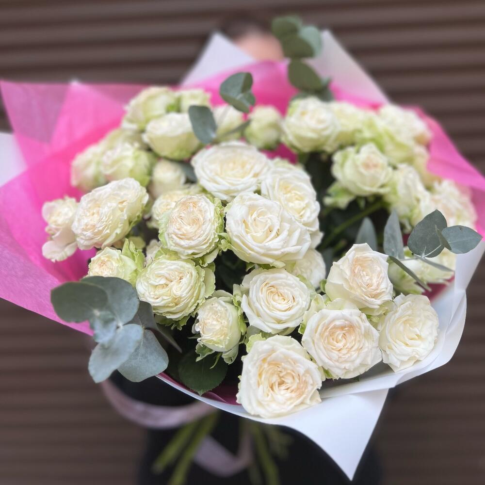 Букет из 9 белых роз с эвкалиптом