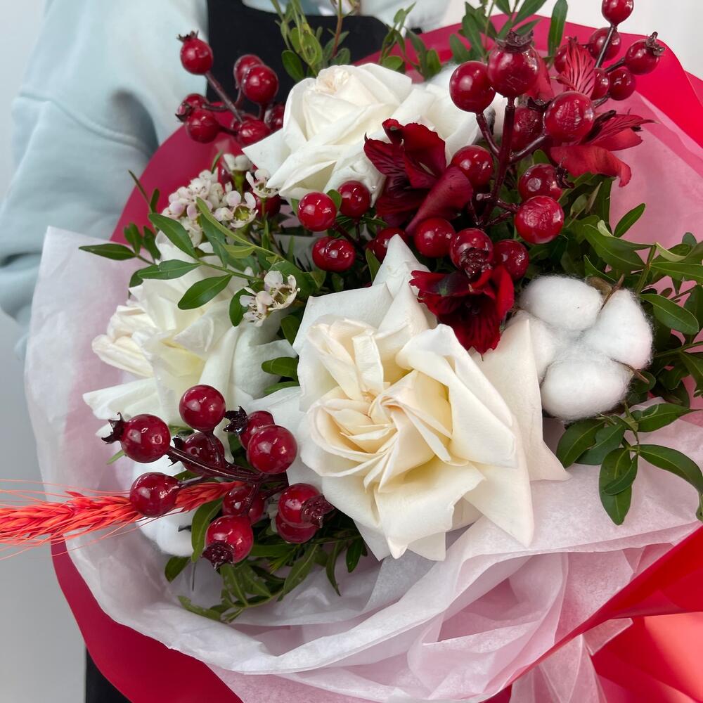 Альстромерия – 1 шт.Роза Охара – 3 шт.Пленка матовая – 6 шт.Хлопок натуральный – 3 шт.Хамелациум белый – 1 шт.фиисташка – 5 шт.ягода декор – 5 шт.