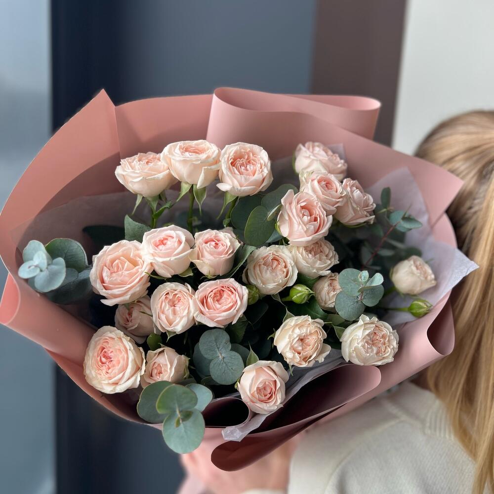 Кустовая пионовидная роза – 5 шт.Эвкалипт – 3 шт.декоративная упаковка – 1 шт.Атласная лента – 1 шт.