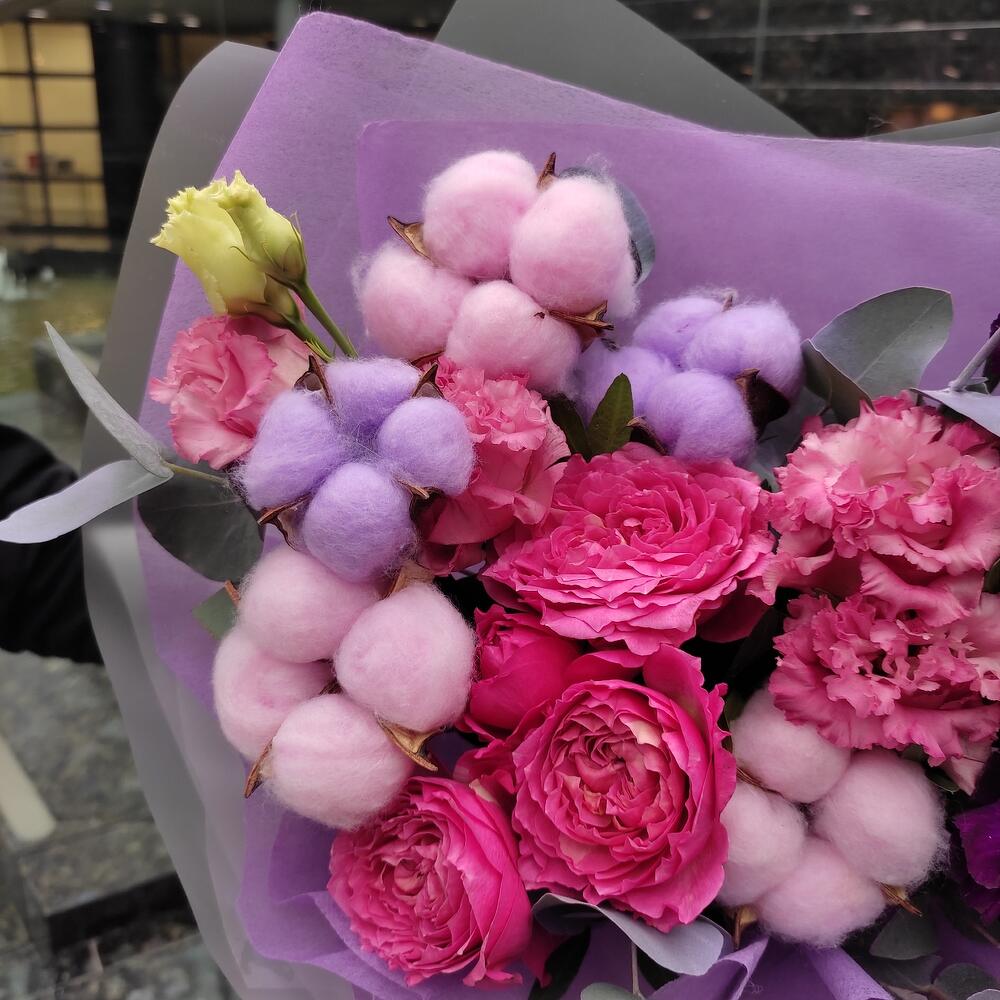 Роза кустовая пионовидная – 1 шт.Лизиантус – 1 шт.Диантус – 2 шт.Хлопок – 6 шт.Пальма – 1 шт.Эвкалипт – 1 шт.Лента – 2 шт.Упаковка дизайнерская – 2 шт.