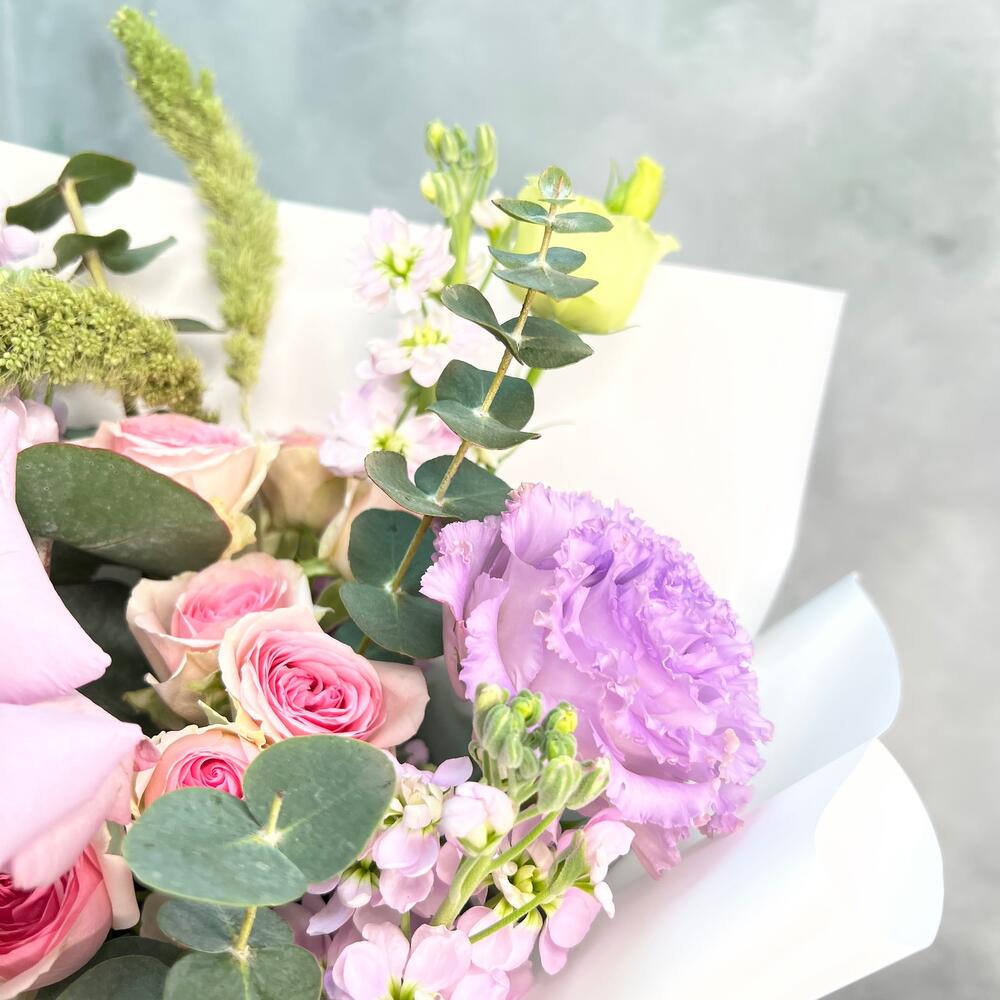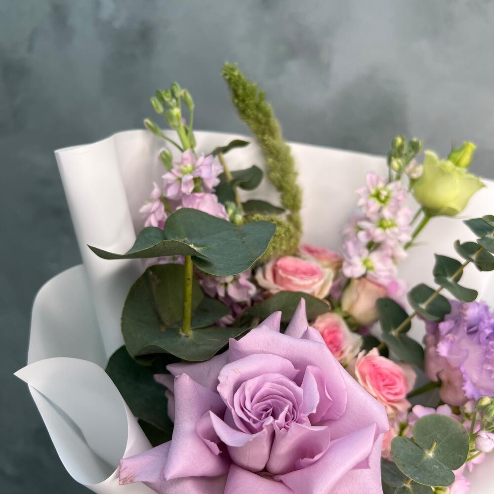 Букет комплимент с ароматной матиолой,французской розой,лизиантус(эустома),эвкалипт