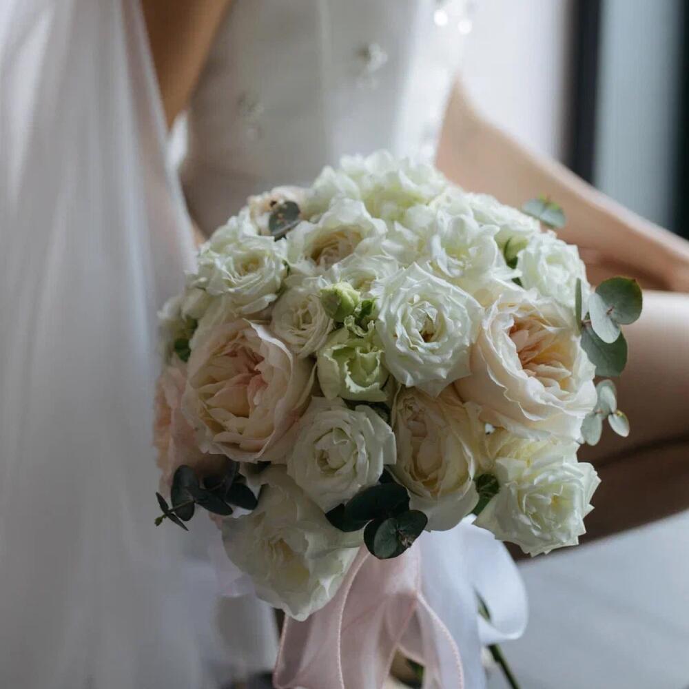 Лизиантус – 3 шт.Фрезия – 5 шт.Эвкалипт – 3 шт.Пионовидная роза – 7 шт.Атласная лента – 3 шт.Кустовая пионовидная роза – 6 шт.