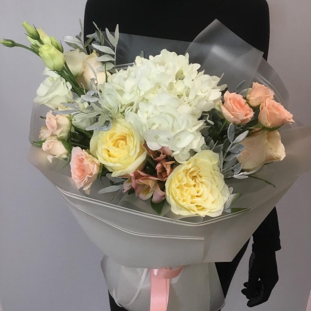 Альстромерия – 1 шт.Гортензия – 1 шт.Кустовая роза – 2 шт.Эустома – 1 шт.Лента атласная – 1 шт.Фисташка – 2 шт.Пленка матовая – 2 шт.роза шарман – 2 шт.роза кендлайт эквадор – 2 шт.