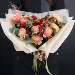 Эвкалипт – 1 шт.Упаковка – 1 шт.Диантус – 5 шт.Стифа – 2 шт.Роза пионовидная кахала – 3 шт.роза кустовая мирабелла – 3 шт.