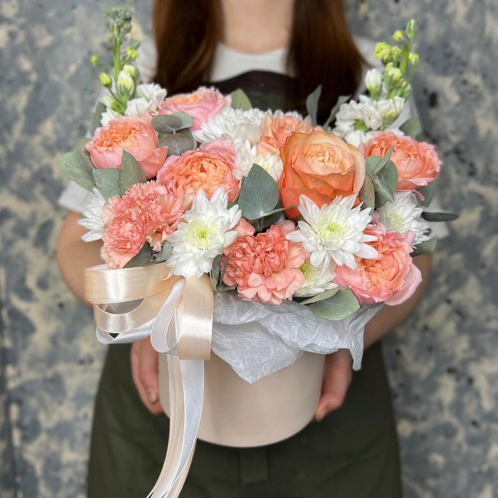 Роза кустовая пионовидная джульетта – 1 шт.Роза пионовидная кахала – 1 шт.Хризантема кустовая – 2 шт.Маттиола – 2 шт.Диантус – 3 шт.Эвкалипт – 2 шт.Лента атласная – 2 шт.Оазис флористический – 1 шт.Коробка шляпная – 1 шт.Тишью белое – 1 шт.