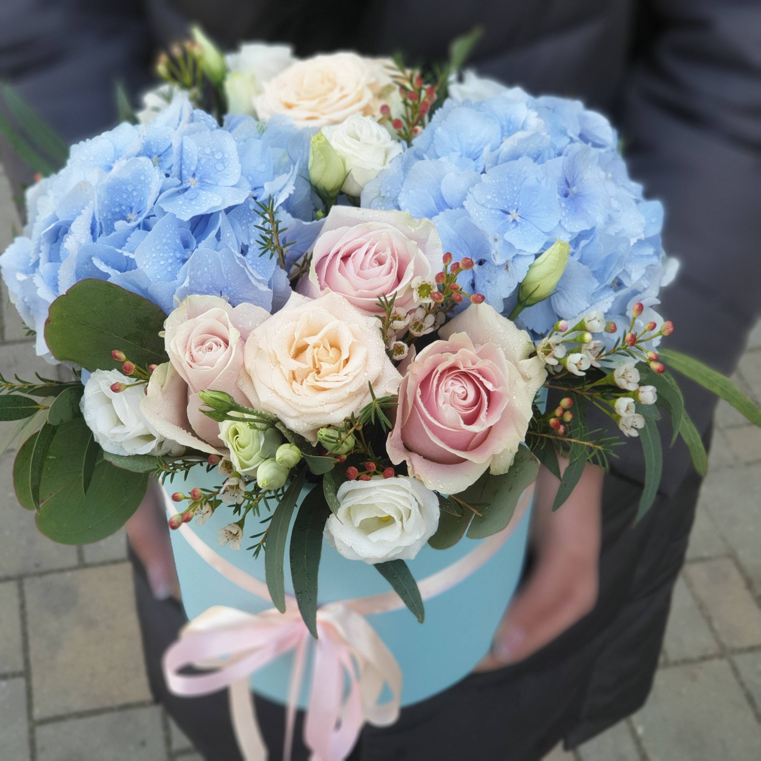 Описание: Голубое небо. Воздушная гортензия прекрасно сочетается с множеством других цветов._x000D_ _x000D_ Мы взяли кустовую розу Жустин, добавили Пинк Мондиаль и Эустому. И завершили цилиндр ароматным хамелациумом и эвкалиптом.