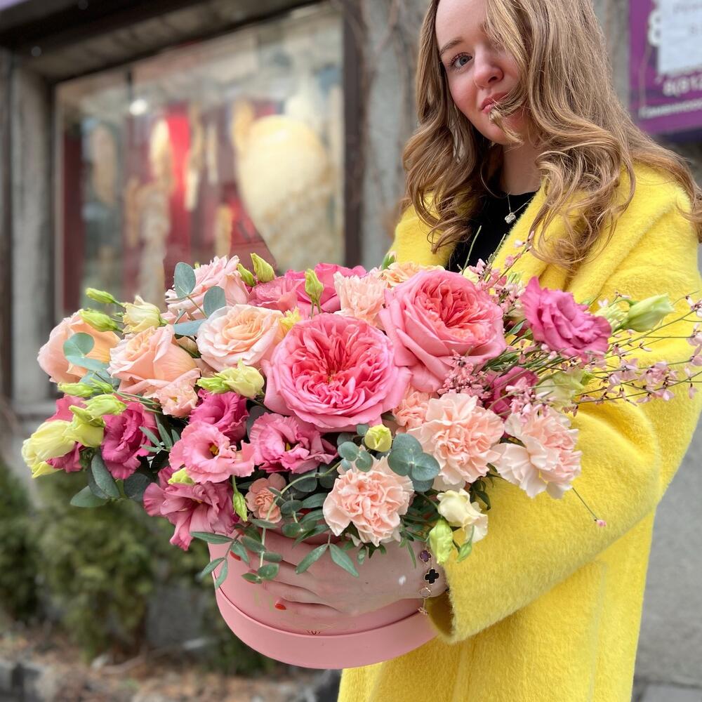 Цветочная коробка с пионовидными розами, лизиантусами, сортовыми диантусами, ароматными веточками джинстер, душистый эвкалипт и разными цветочными изысками!