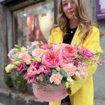 Роза пионовидная – 3 шт.Фисташка – 4 шт.Роза – 6 шт.Диантус кустовой – 3 шт.Диантус – 6 шт.Эвкалипт – 2 шт.Лизиантус – 5 шт.Гениста – 2 шт.Коробка шляпная – 1 шт.Оазис флористический – 2 шт.цветы микс – 10 шт.