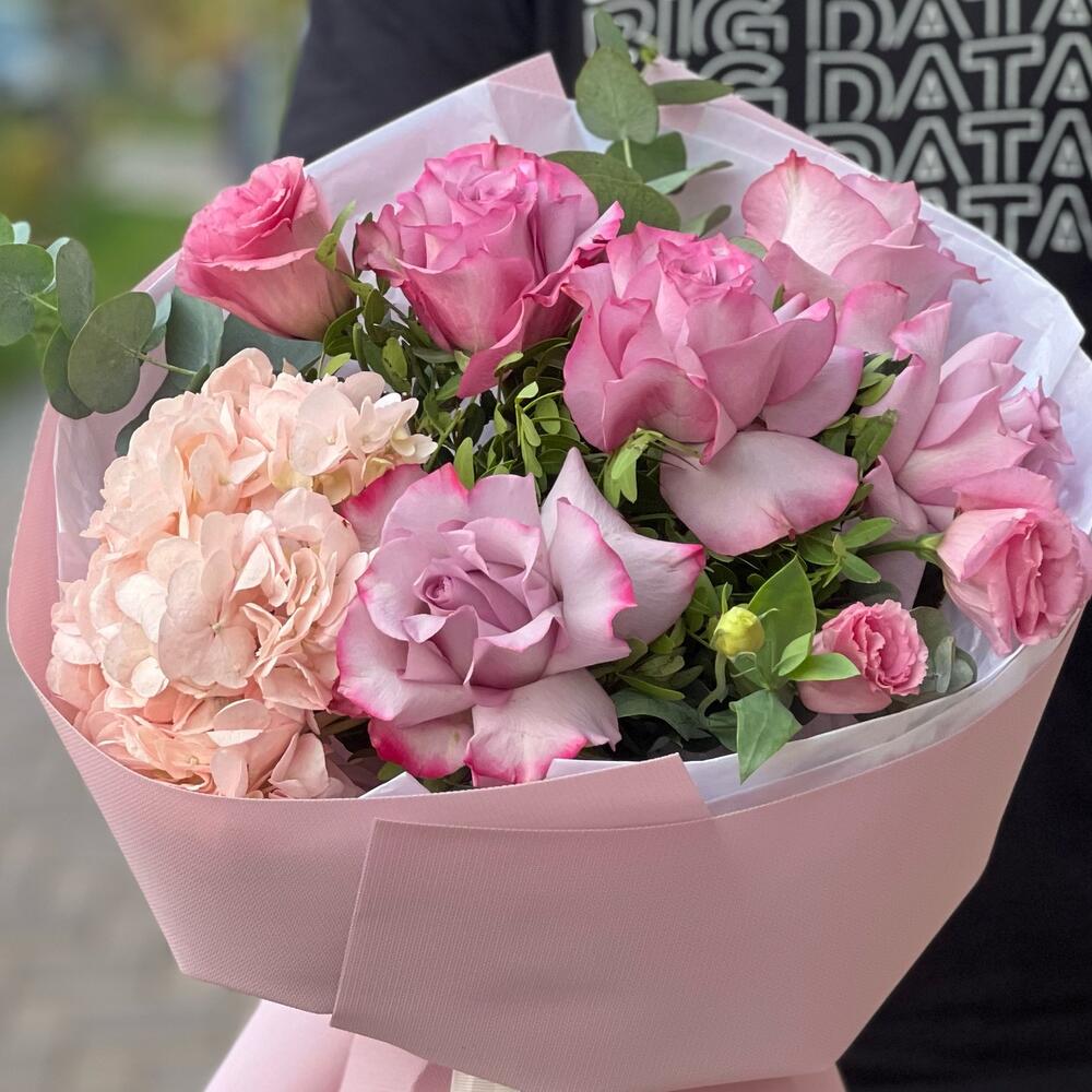 Гортензия – 1 шт. Лизиантус – 2 шт. Роза розовая – 5 шт. Эвкалипт – 1 шт.