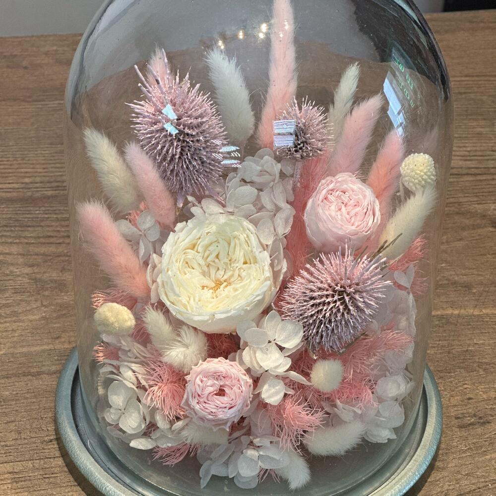 Клош из стекла – 1 шт.Роза стабилизированная – 3 шт.краспедия стабилизированная – 2 шт.гортензия стабилизированная – 2 шт.эрингиум сухоцвет – 3 шт.Лагурус (сухоцвет) – 20 шт.